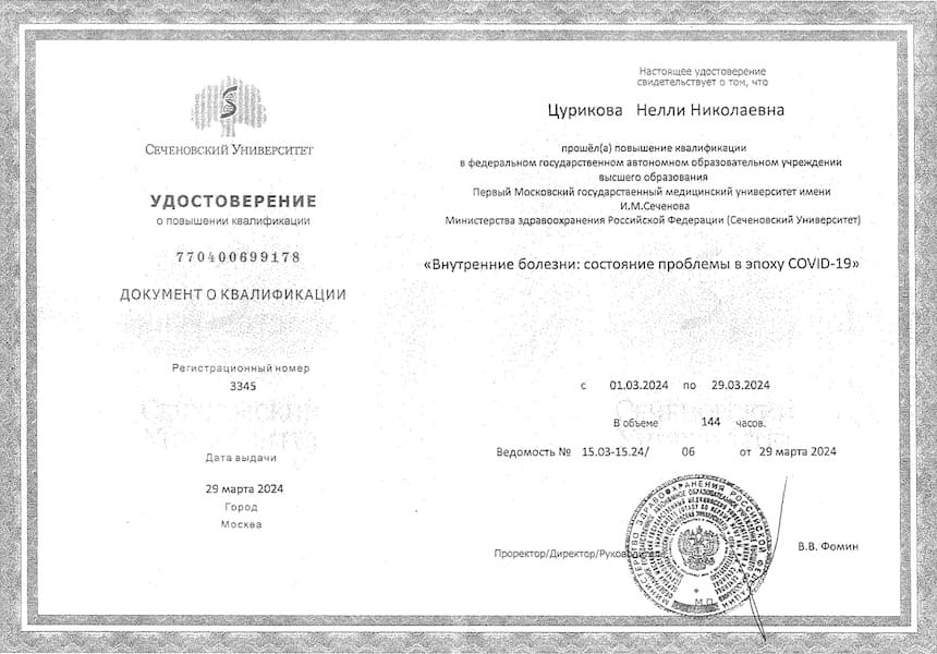 - 2021 г. – «Гастроэнтерология» на базе 1-го МГМУ имени И.М. Сеченова МЗ РФ. Последняя аккредитация «Гастроэнтеролог» (действует с 24.09.2021г.)
