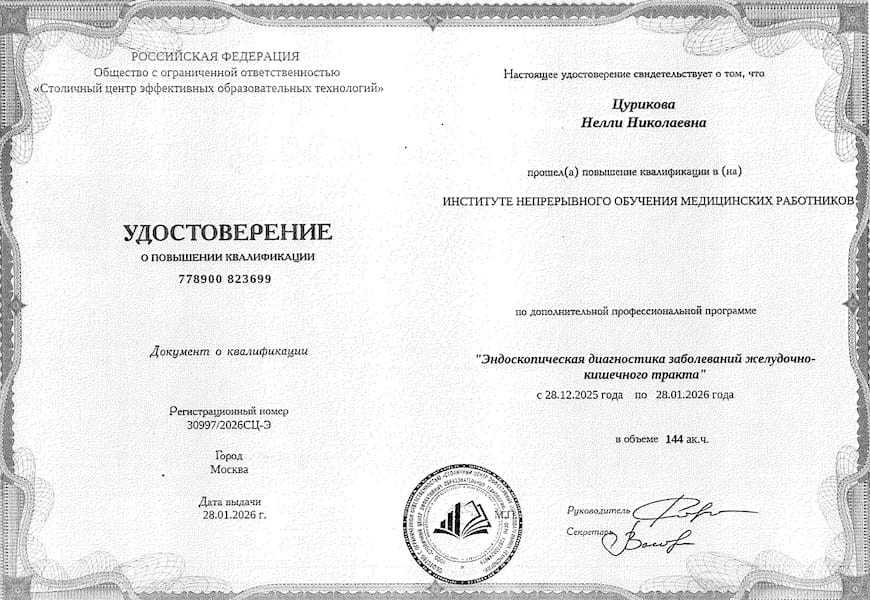 - 2026 г. – «Эндоскопическая диагностика заболеваний ЖКТ», ООО «Столичный центр эффективных образовательных технологий», г.Москва