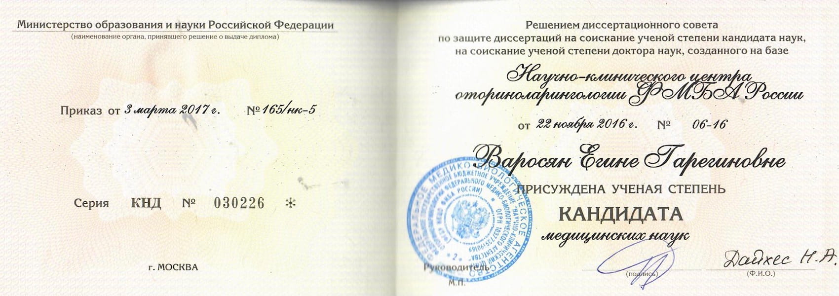- 2016 г. – Защитила кандидатскую диссертацию на тему «Оптимизация способов реконструкции задней стенки наружного слухового прохода у пациентов с эпитимпанальной формой гнойного среднего отита» на базе ФГБУ НКЦО ФМБА РФ