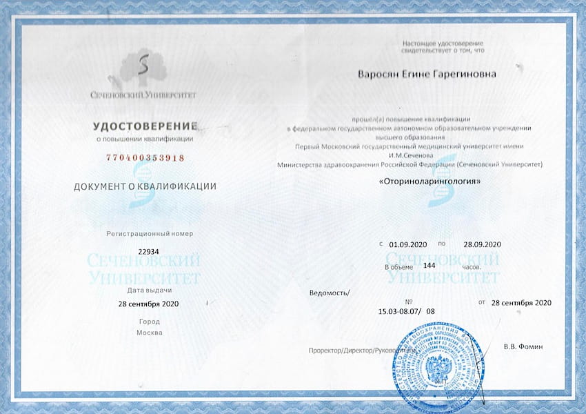 - 2020 г. – «Оториноларингология», ФГАОУ ВО «Первый Московский государственный медицинский университет им. И.М. Сеченова» МЗ РФ