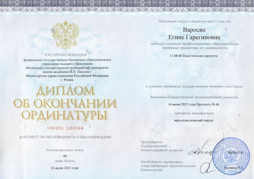 - 2022 г. – Ординатура по специальности «Пластическая хирургия» на базе ФГБОУ ВО «Рязанский государственный медицинский университет имени академика И.П. Павлова» МЗ РФ, г.Рязань