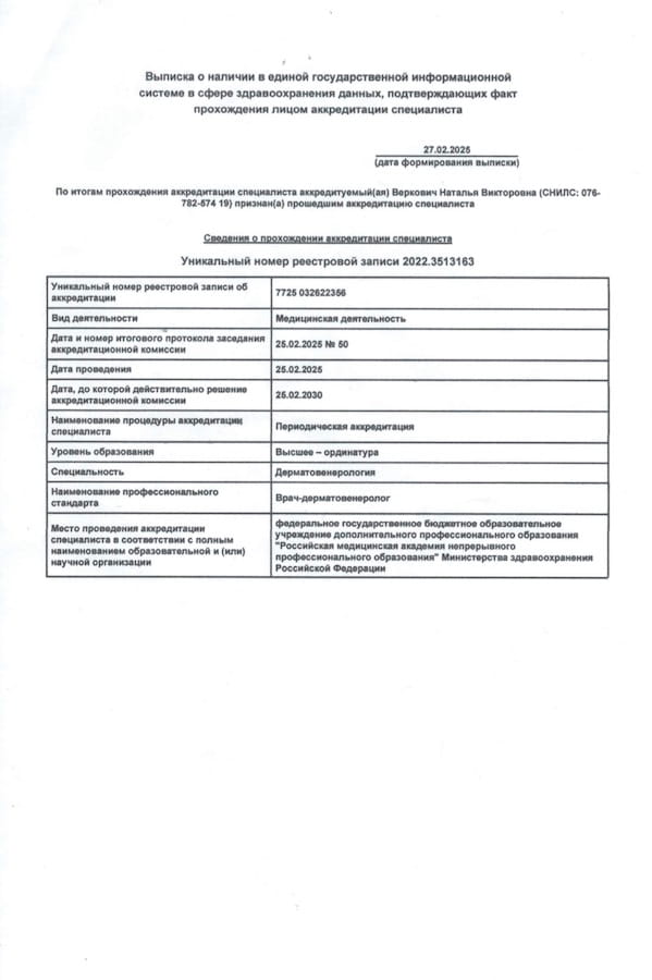 - 2025 г. – аккредитация по специальности «Дерматовенерология», Единая государственная информационная система в сфере здравоохранения