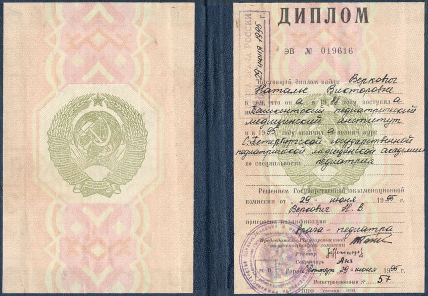 - 1993 г. – специальность «Педиатрия», Санкт-Петербургская государственная педиатрическая медицинская академия
