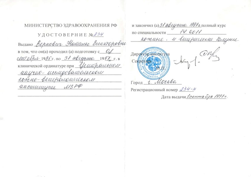 - 1997 г. – клинический ординатор по специальности Кожные и венерические болезни под руководством академика РАН и РАМН Скрипкина Ю.К., Центральный научно-исследовательский кожно-венерологический институт Министерства здравоохранения Российской Федерации