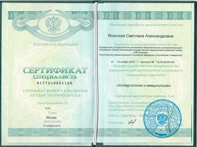 - "Аллергология и иммунология", Первый Московский государственный медицинский университет имени И. М. Сеченова (1998 г.)
